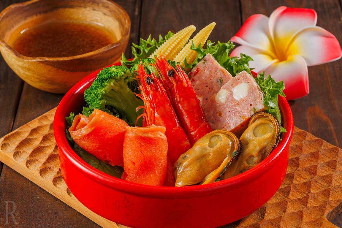 福島牛、イベリコ入りウインナー、ホタテ、開きエビ